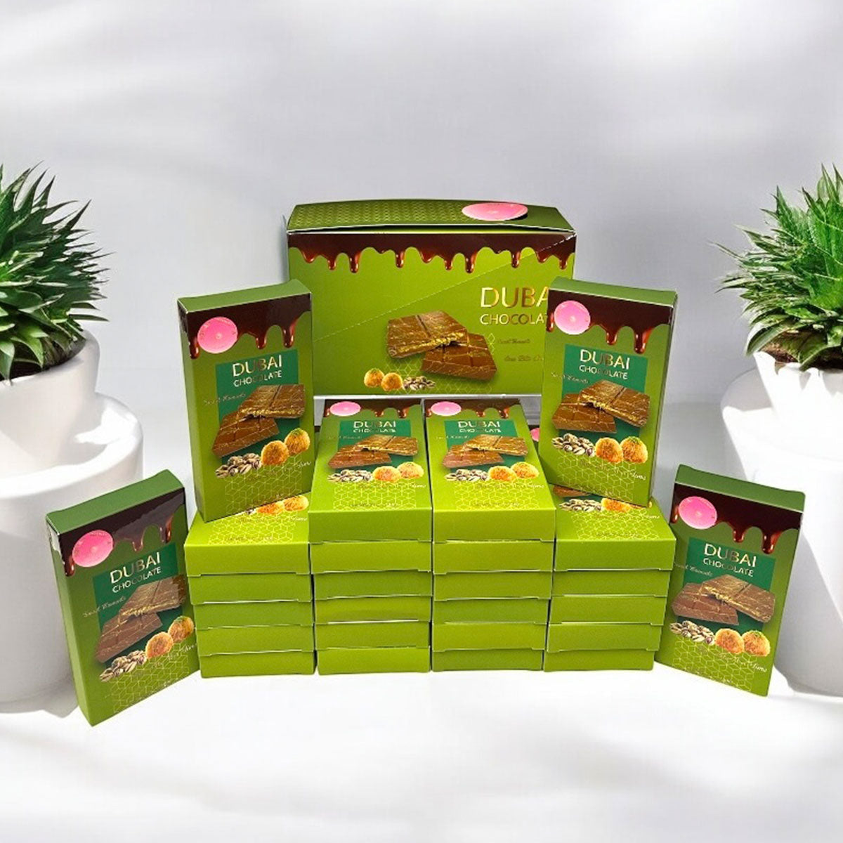Our Dubai Chocolate Bar is crafted with care, blending smooth, velvety milk Belgian chocolate, with rich pistachio paste and crunchy pistachio pieces as well buttery Kataifi for a luxurious flavor and texture. Every bar is made with high-quality ingredients to highlight the natural taste of the nuts and chocolate, creating a perfect balance of creaminess and crunch. At Sugar Rush LA, we pride ourselves on creating artisan chocolates that are as beautiful as they are delicious—thoughtfully made to bring a touch of indulgence in every bite.